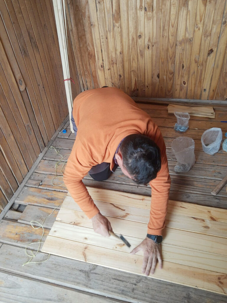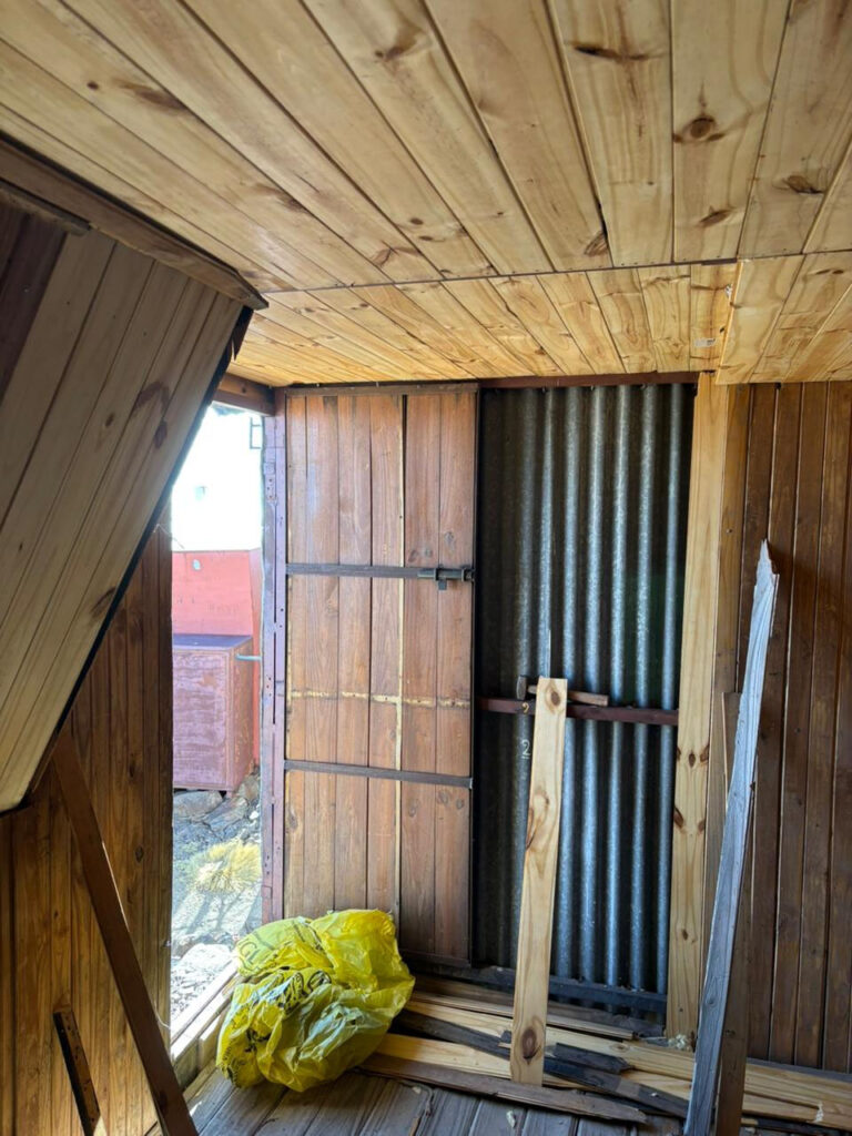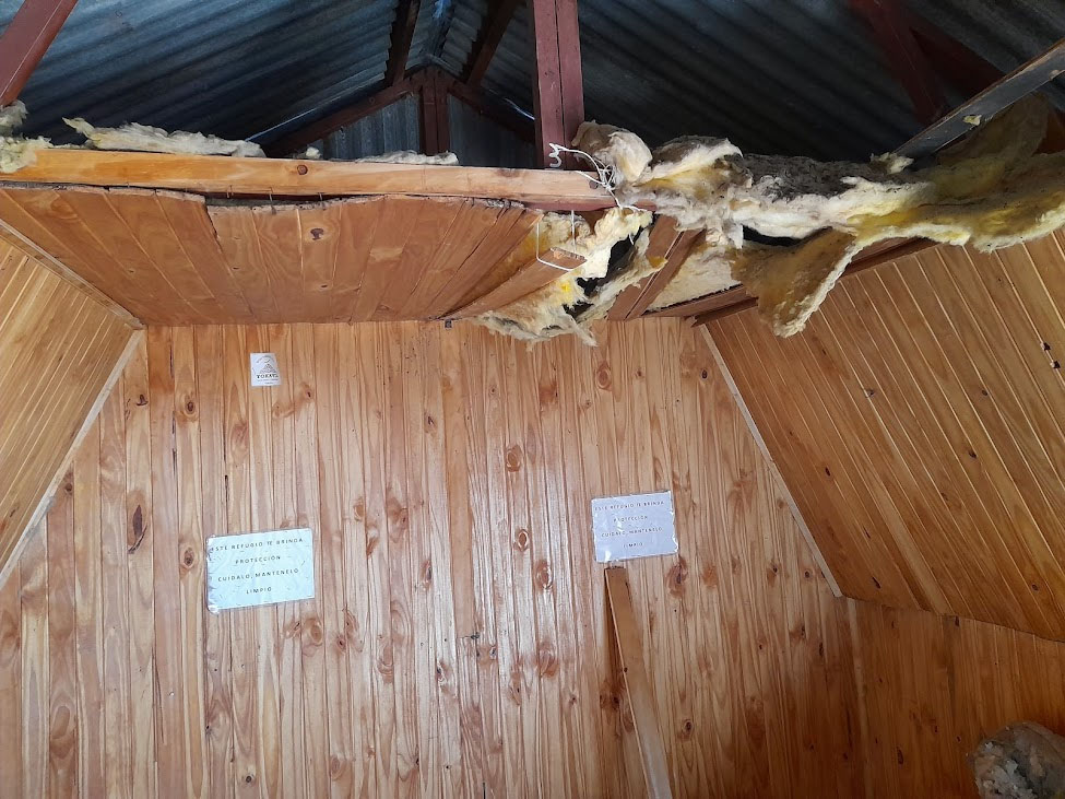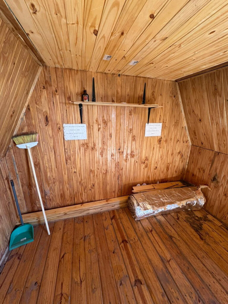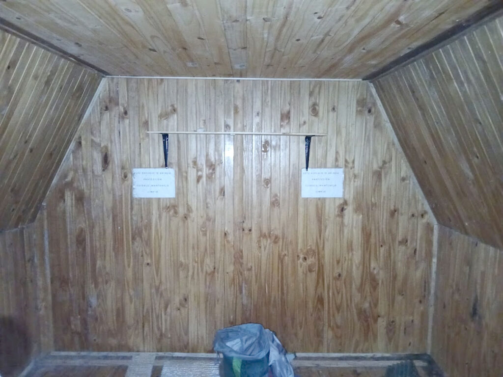 Se ha recolocado el aislante térmico, en las paredes y el techo, se reparó y se colocó el machimbre que faltaba en el techo y paredes, se reparó la mesita y se colocaron 2 repisas, se realizaron ajustes para que la puerta se cierre sin dificultad, aparte al machimbre se le aplicó capas de aceite de linaza para su mejor conservación, se colocaron los tapajuntas. Se mejoró el acceso, pero no estamos conforme, lo vamos a dejar mejor y otras ideas que tenemos las vamos a llevar a cabo para hacerlo más confortable.