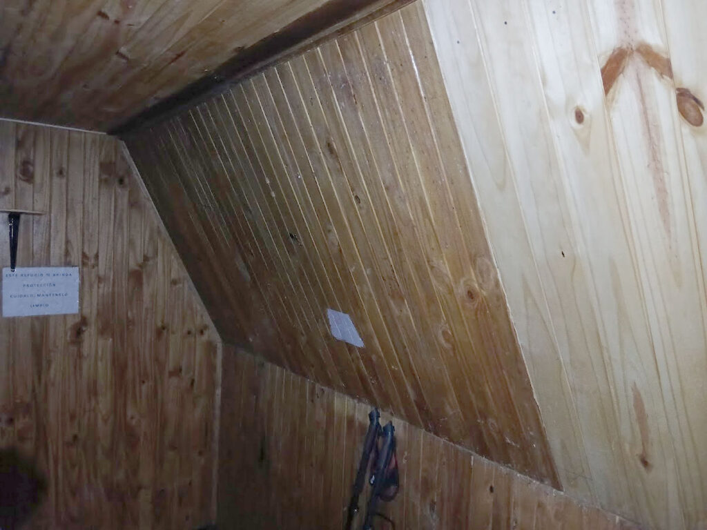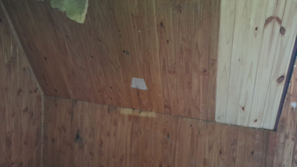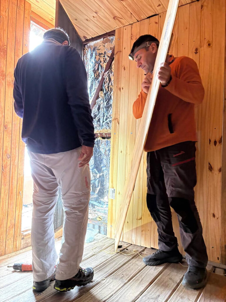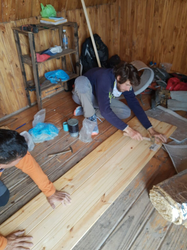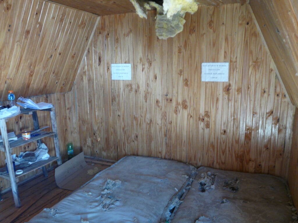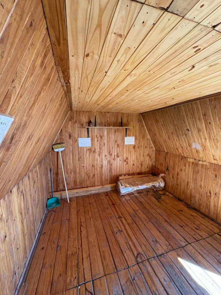 Se ha recolocado el aislante térmico, en las paredes y el techo, se reparó y se colocó el machimbre que faltaba en el techo y paredes, se reparó la mesita y se colocaron 2 repisas, se realizaron ajustes para que la puerta se cierre sin dificultad, aparte al machimbre se le aplicó capas de aceite de linaza para su mejor conservación, se colocaron los tapajuntas. Se mejoró el acceso, pero no estamos conforme, lo vamos a dejar mejor y otras ideas que tenemos las vamos a llevar a cabo para hacerlo más confortable.