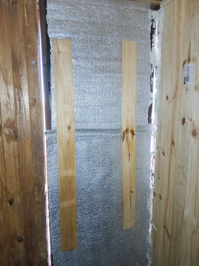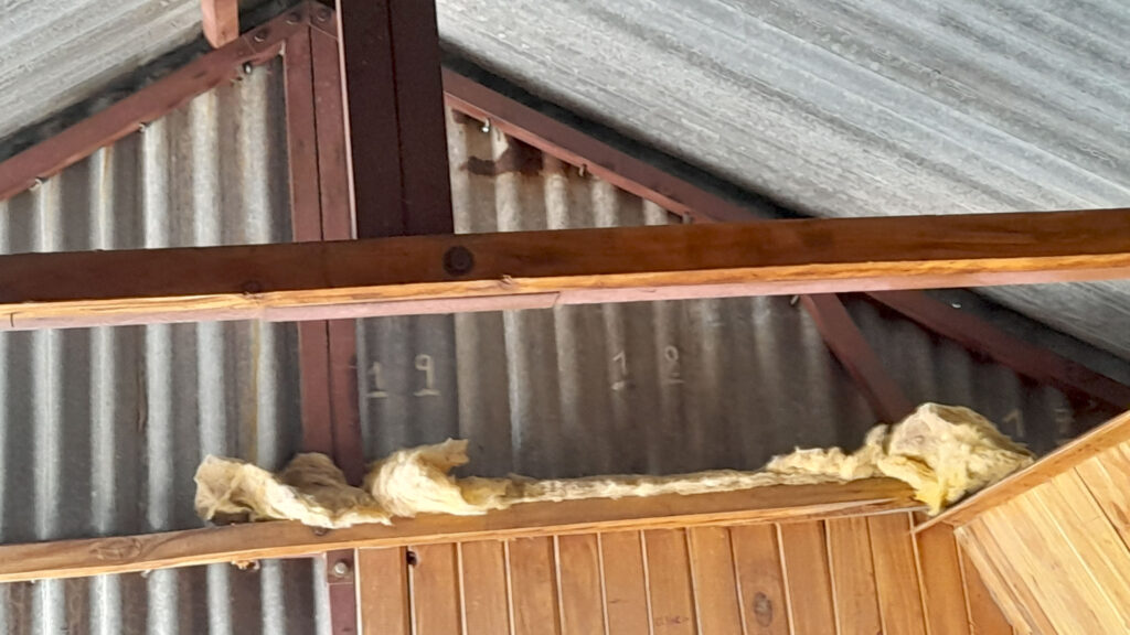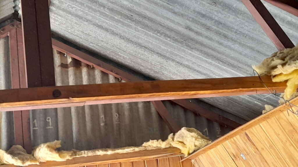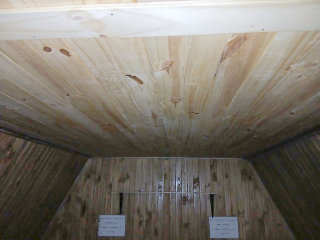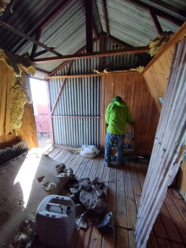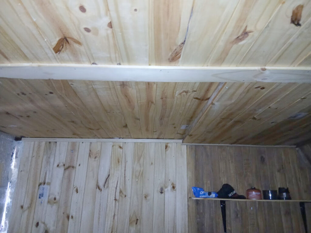 Se ha recolocado el aislante térmico, en las paredes y el techo, se reparó y se colocó el machimbre que faltaba en el techo y paredes, se reparó la mesita y se colocaron 2 repisas, se realizaron ajustes para que la puerta se cierre sin dificultad, aparte al machimbre se le aplicó capas de aceite de linaza para su mejor conservación, se colocaron los tapajuntas. Se mejoró el acceso, pero no estamos conforme, lo vamos a dejar mejor y otras ideas que tenemos las vamos a llevar a cabo para hacerlo más confortable.