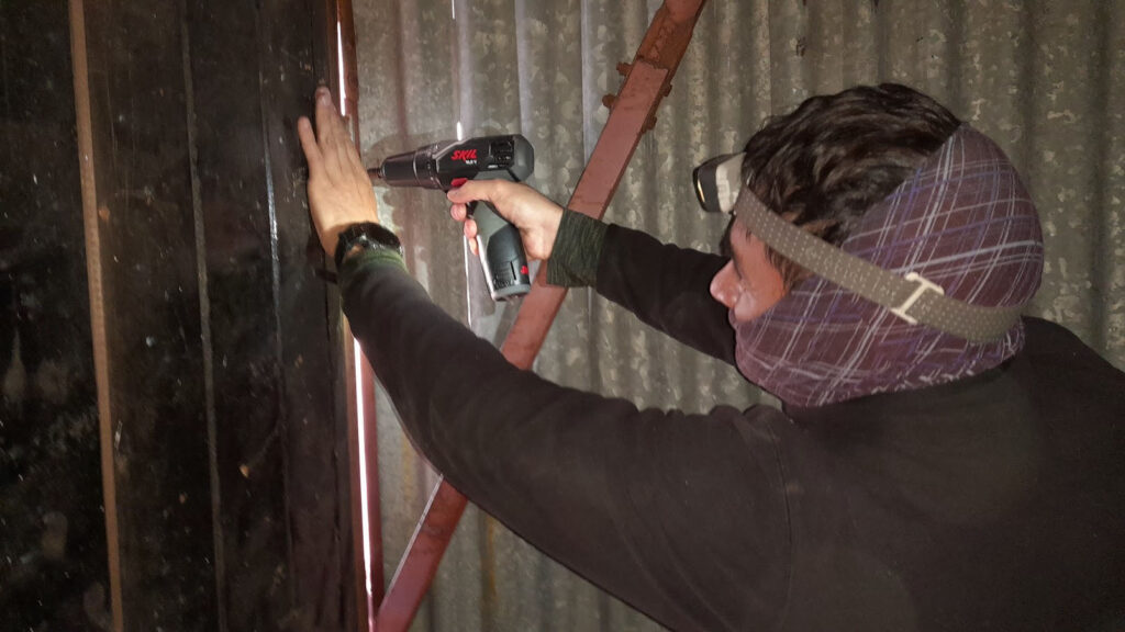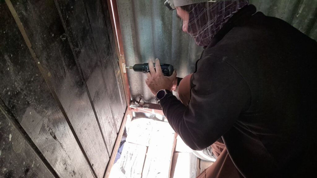 El primer trabajo lo pudimos concretar en mayo de este año que fue colocar la puerta, y a partir de allí se encaró la reconstrucción del machimbre de las paredes, el techo y el piso.