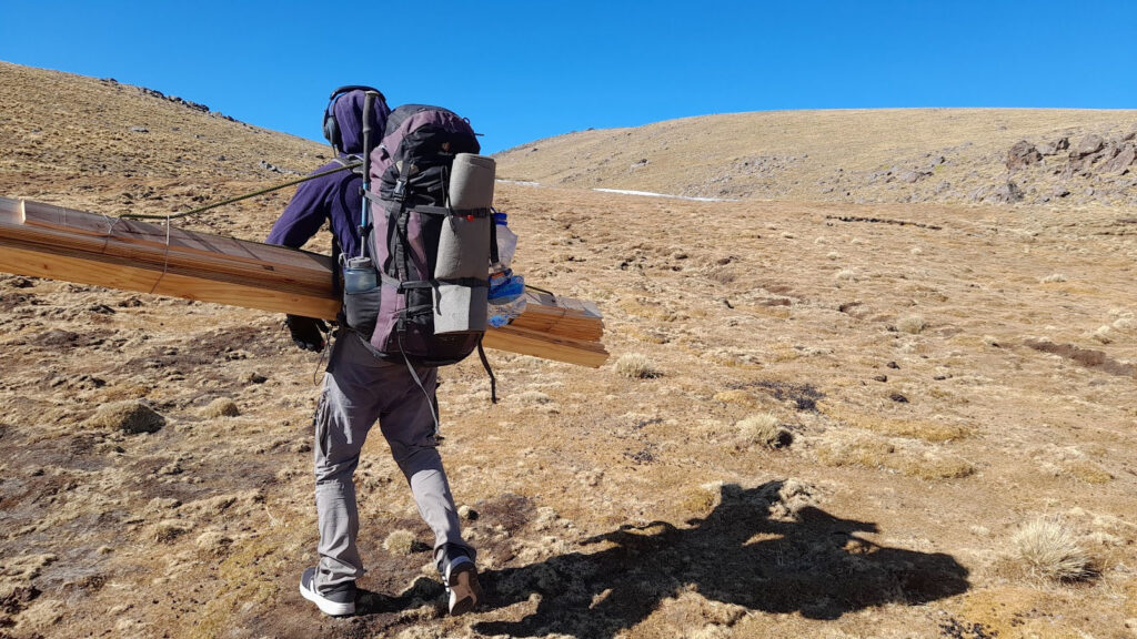 Todas las maderas, aislantes y el resto de los materiales necesarios se subieron a pulso, la única herramienta a batería que se uso fue un taladro, todo lo demás con herramientas de mano y MUCHAS, MUCHAS GANAS DE HACER LO MEJOR!!!!.